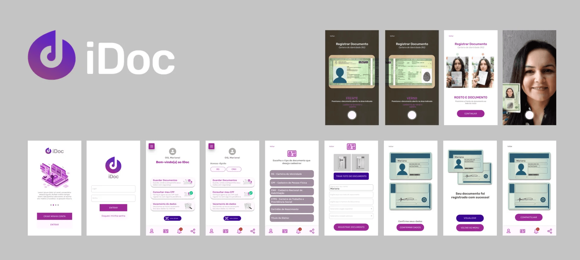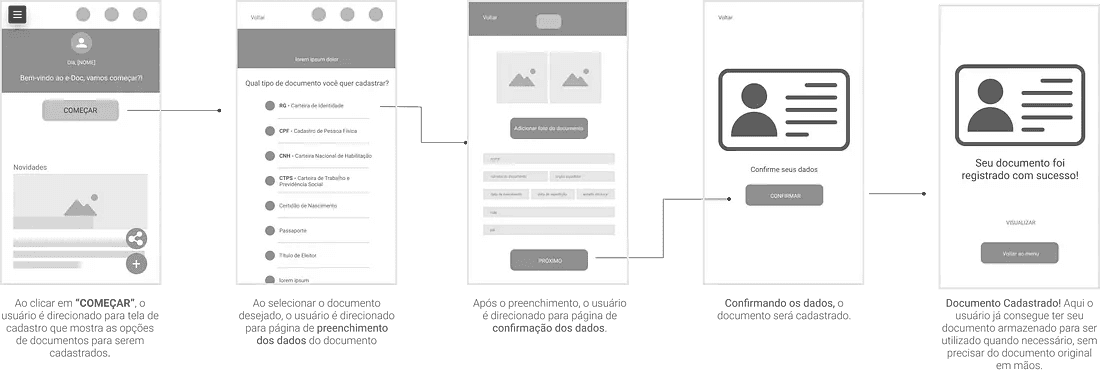 Tendo como referência nossa matriz Impacto x Esforço, fizemos a primeira sprint e criamos as principais telas que serão a base do nosso aplicativo (login, home e telas que compõem o cadastro do documento).