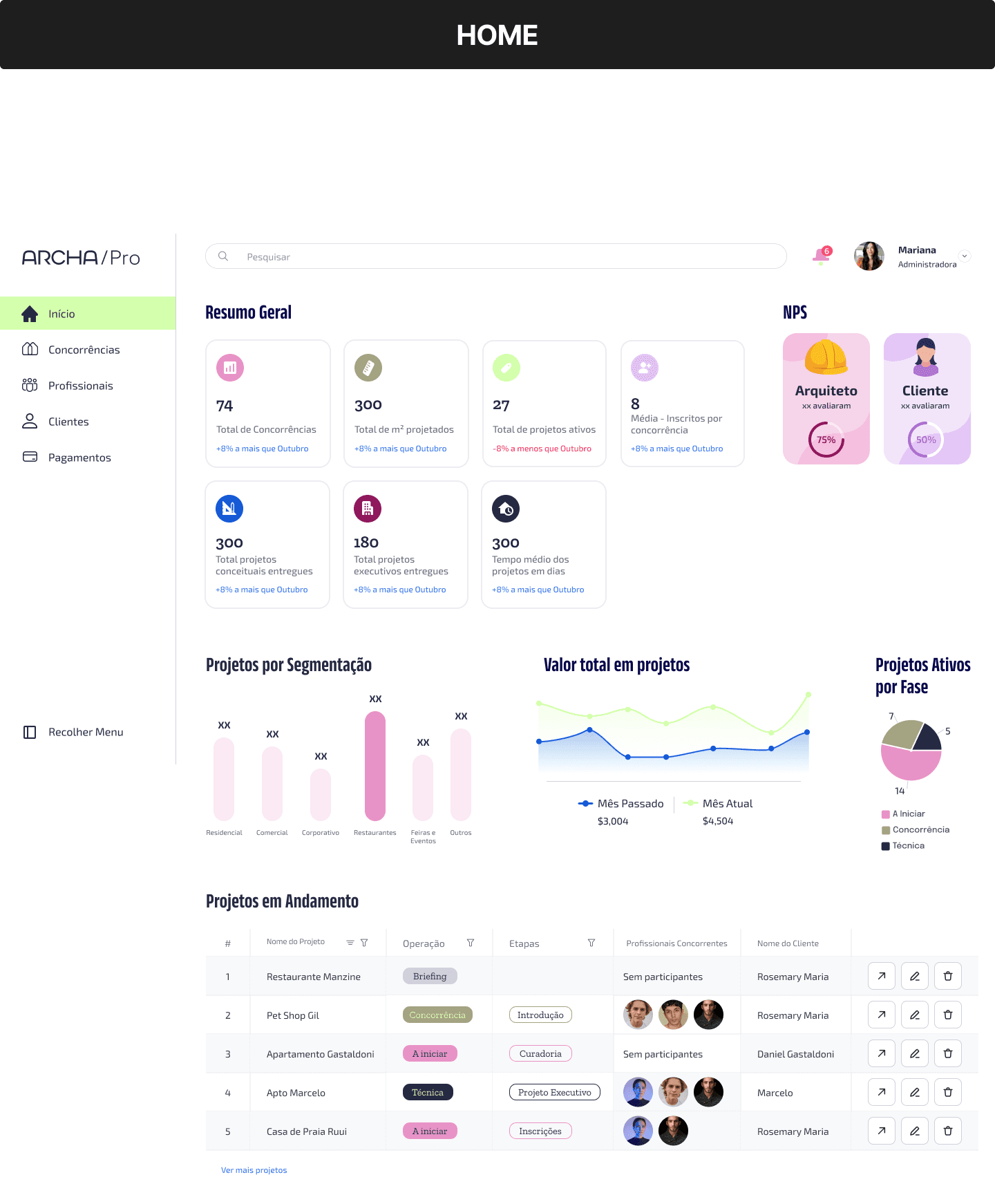Mudaria: Ordem dos relatórios, projetos ativos por fase mais importante. Calendário em termo de cronograma/kanban, mais pra gestão dos projetos. Lista com atividades a serem feitas.